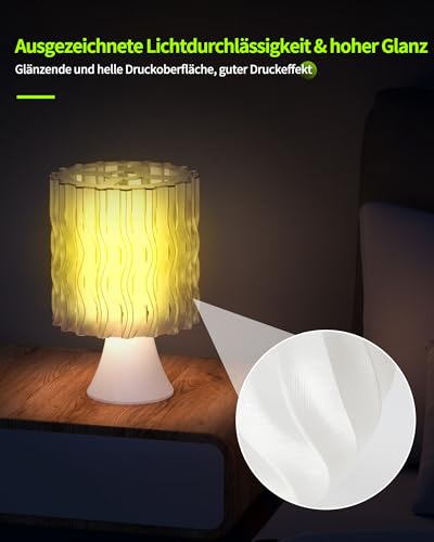 𝐁𝐞𝐬𝐬𝐞𝐫𝐞 𝐋𝐢𝐜𝐡𝐭𝐝𝐮𝐫𝐜𝐡𝐥ä𝐬𝐬𝐢𝐠𝐤𝐞𝐢𝐭: Nutzen Sie die hervorragenden Lichtdurchlässigkeitseigenschaften des filament-3d-druckmaterialien, um klare, glatte Bilder zu drucken. Ob Dekorationen, Schutzhüllen oder transparente Teile – die Transparenz dieses Filaments ist unübertroffen.