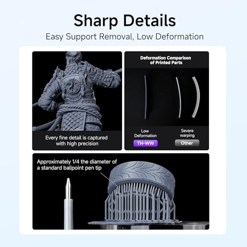 【Geringe Verformung – Stabil auch über lange Zeit】Dank langwieriger Vergleichstests zeigt die TH-WW kaum Verformung – auch nach längerer Lagerung. Dies macht sie zur perfekten 3d druck resin für filigrane oder flache Komponenten wie Waffen, Flügel oder Rüstungsplatten. Für Nutzer, die auf Maßhaltigkeit und Formtreue setzen