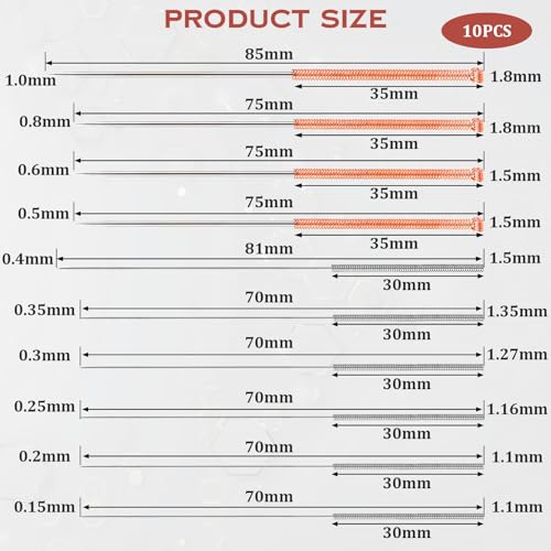 【Verschiedene Größen】Es gibt 10 verschiedene Größen, nämlich 0,15mm, 0,2mm, 0,25mm, 0,3mm, 0,35mm, 0,4mm, 0,5mm, 0,6mm, 0,8mm, 1,0mm, die mit den meisten 3D-Druckern kompatibel sind und effektiv kleine Druckerdüsen reinigen und die Druckgenauigkeit verbessern können