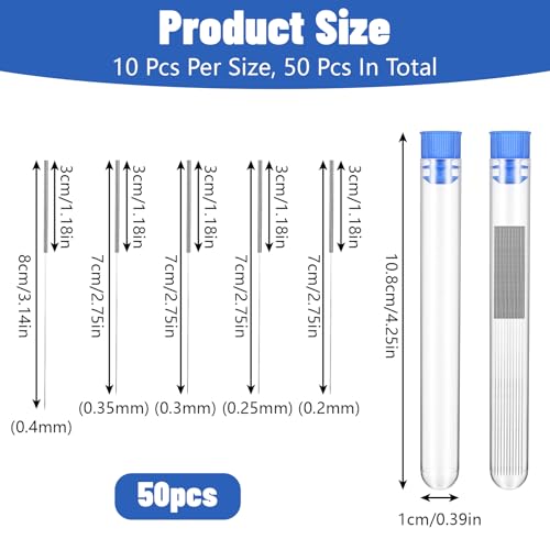 【3D Drucker Düse Reinigung Kit】Die 3D drucker düsen reinigungsnadel kann verstopfungen und rückstände in der Düse effektiv entfernen, um Druckqualität und Stabilität zu gewährleisten. Das 50 stück nozzle reinigungsnadel hat einen durchmesser von 0.2/0.25/0.3/0.35/0.4mm und insgesamt 5 verpackungsrohr, Jedes Röhrchen enthält zehn Reinigungsnadeln, Die Menge reicht aus, um Ihren täglichen Gebrauch und Ersatzbedarf zu decken.