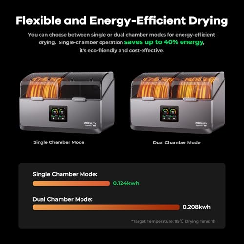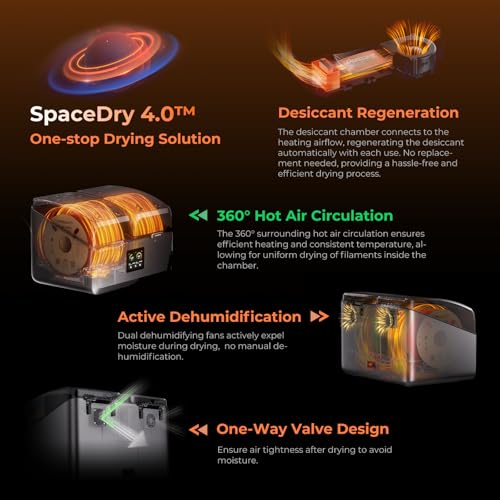 Zweikammer-Mehrmaterial-Trocknungssystem: Das Creality SpacePi X4 filament trockner verfügt über zwei unabhängige, luftdichte Kammern, die es ermöglichen, 4 Filamentrollen gleichzeitig zu trocknen. Durch 85 °C aktive Entfeuchtung wird die Luftfeuchtigkeit in jeder Kammer konstant unter 10 % RH gehalten, um zu verhindern, dass Filamente spröde werden. Ideal für Lehrkräfte, die vielfältige Klassenraummaterialien verwalten, Ingenieure, die Hybridteile prototypisieren, oder Bastler, die an mehrfarbigen Modellen arbeiten.