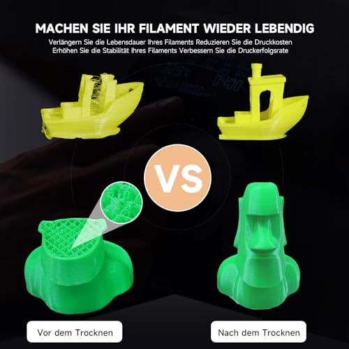 【Hohe Kompatibilität】Trocknen Sie alle gängigen Filamentgrößen und -typen, egal ob PLA, PETG, TPU, ABS usw; Filamentdurchmesser von 1,75mm, 2,85mm und 3,00mm sowie Rollen mit einem Gewicht von 250g, 500g und 1kg sind mit der Firefly Trockenbox kompatibel. Die maximale Temperatur beträgt 70°C;