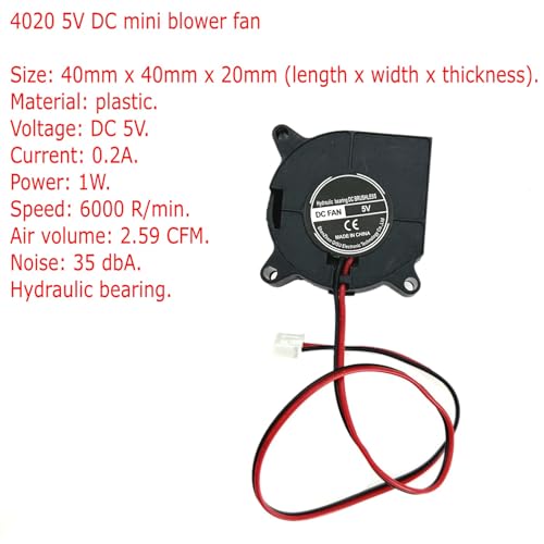 Größe: 40mm x 40mm x 20mm (Länge x Breite x Dicke). Spannung: DC 5V. Strom: 0.2A. Leistung: 1W. Geschwindigkeit: 6000 U/min. Luftvolumen: 2.59 CFM. Lärm: 35 dBA. Hydraulisches Lager. Material: Kunststoff. Dieser bürstenlose Mini-Gebläse 4020 5V DC ist geräuscharm, vibrationsarm und läuft zuverlässig.