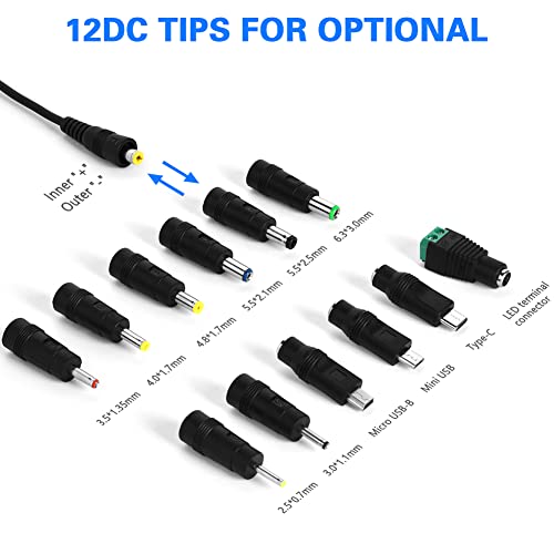 【Was Sie bekommen】 12 Adapterspitzen: 2,5 x 0,7 mm, 3,0 x 1,1 mm, 3,5 x 1,35 mm, 4,0 x 1,7 mm, 5,0 x 2,1 mm, 5,0 x 2,5 mm, 6,3 x 3,0 mm, 4,8 x 1,7 mm, LED-Anschluss Verbinder Mini-USB, Typ-C, Micro-USB-B. Und die variable Spannung ist einfach auszuwählen, Sie können mit dem mitgelieferten Schlüssel in eine andere Spannung umwandeln.