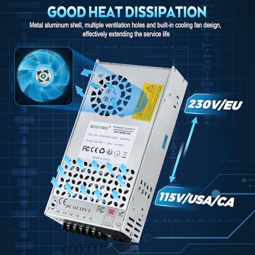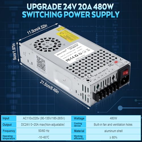 BOSYTRO Upgrade Netzteil 24V 20A 480W Schaltnetzteil Adapter Transformator LED Treiber AC110V / 220V (SMPS) für 3D Drucker, CCTV-Kamerasicherheitssystem,Radio,Computerprojekt(Ohne Netzkabel)