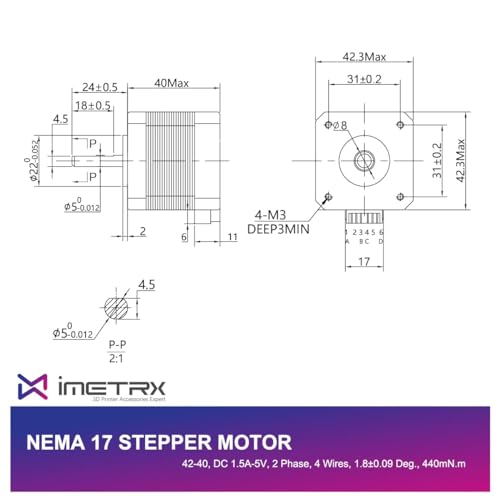 iMetrx NEMA 17 Schrittmotor 42x40mm Motor Extruder 1.5 A-3.8 V 2-Phasen 4-Draht 1.8 Grad, mit 1-Meter Kabel, für 3D Drucker Motor 1 Stück