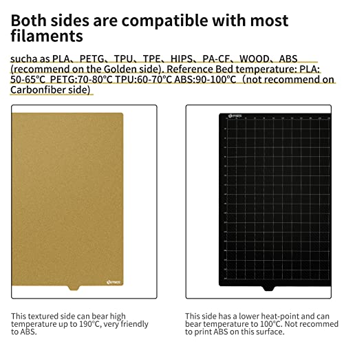 Material: Stahl+PEI+PET, Die Oberfläche der PET-Kohlefasertextur kann hohen Temperaturen von 100℃ standhalten, und die PEI-Pulverseite ist bis zu 190 °C. Aber lassen Sie die beheizte Düse nicht die Oberfläche berühren, oder es wird die Oberfläche beschädigen.