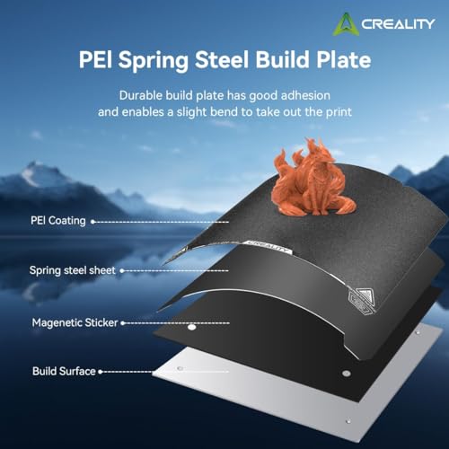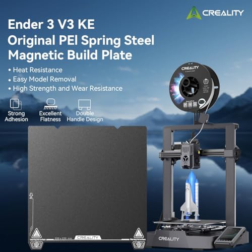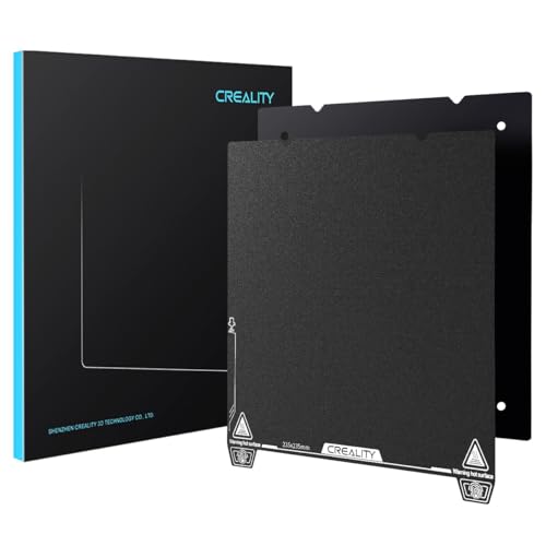 100% Official Creality Ender 3 V3 KE build plate, original 235*235mm spring steel removable flexible textured heated bed platform. The spring steel plate can withstand the numerous heat cycles that a 3D printer bed goes through from print to print. 235*235mm spring steel build plate 3d printer bed compatible with Ender 3/ Ender 3 v2/ Ender 5/ Ender 3 S1/Ender 3 S1 Pro/Ender 5 S1/Ender 3 Neo/Ender 3 V2 Neo/Ender 3 V3 SE/Ender 3 V3 KE/3V3 CR 10 SE/K1/K1C and other same-sized beds. After replacing the printing bed, please level the bed again for better printing results. Easy to remove the prints without tools, just take out the spring steel plate and slightly flex it repeatedly to pop your prints right off. No need to scratch, pry and damage your prints