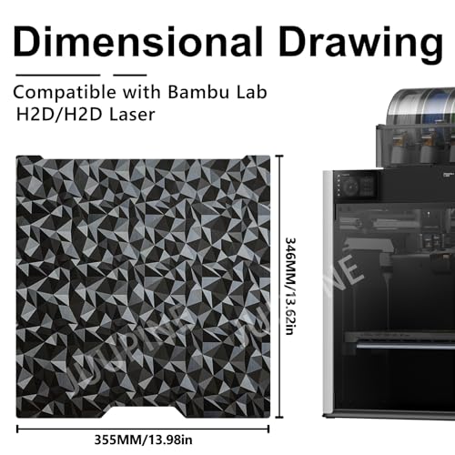 Fit for 3D Printer Models: The double sided PET and PEO build plate is 350x320mm and designed to be compatible with bambu lab h2d 3d printer.Please confirm your 3D printer model and printing platform size before ordering.