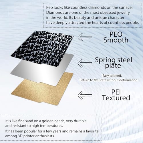 【Verbesserter doppelseitiger Druck】Doppelseitige PEO+PEI-Federstahlplatte, eine Seite ist eine glatte Rautendruckoberfläche – verbesserte PEO-Folie, die andere Seite ist eine mattierte PEI-Oberfläche, die der mattierten Aufkleberoberfläche einen unverwechselbaren mattierten Touch verleiht und für mehr sorgt Haftung am Modell und Ausdrucke ohne Verzug.