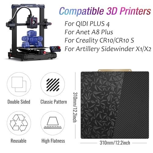 Lieferumfang: 1 x PEO-PET druckplatte, 310 x 310 mm (keine magnetische plate). Kompatible 3D-Drucker für QIDI Plus 4, für Artillery Sidewinder X1/X2, für Creality CR10/CR10 S, für Anet A8 Plus.