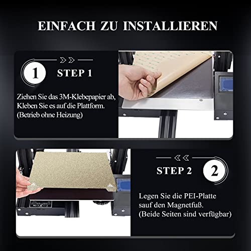 ✔️ 【Einfache Installation】 Die Ender 3 PEI druckplatte besteht aus zwei Teilen, einer flexiblen Stahlplattform mit strukturiertem PEI auf beiden Seiten und einer Magnetische Basis mit Klebstoff auf der Rückseite. Befestigen Sie einfach die magnetische basis an Ihrem Heizbett und legen Sie die flexible Stahlplattform mit PEI-Oberfläche darauf.